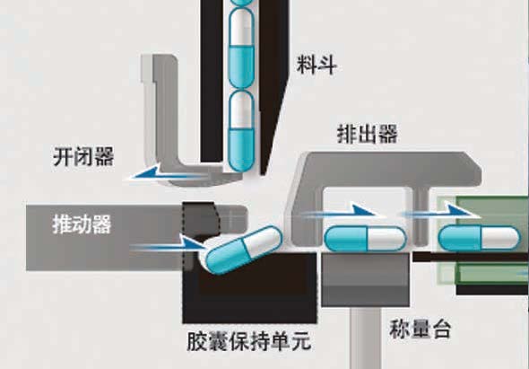通過開閉器使料斗內的膠囊逐一落下,