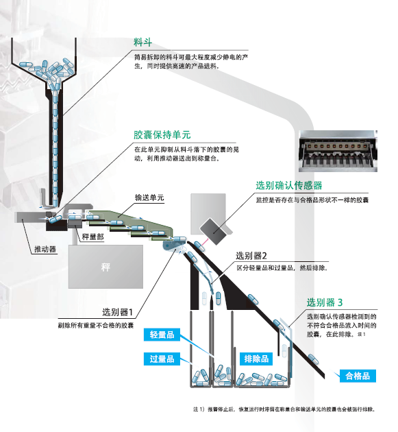 通過3個選別器排出重量不合格的膠囊